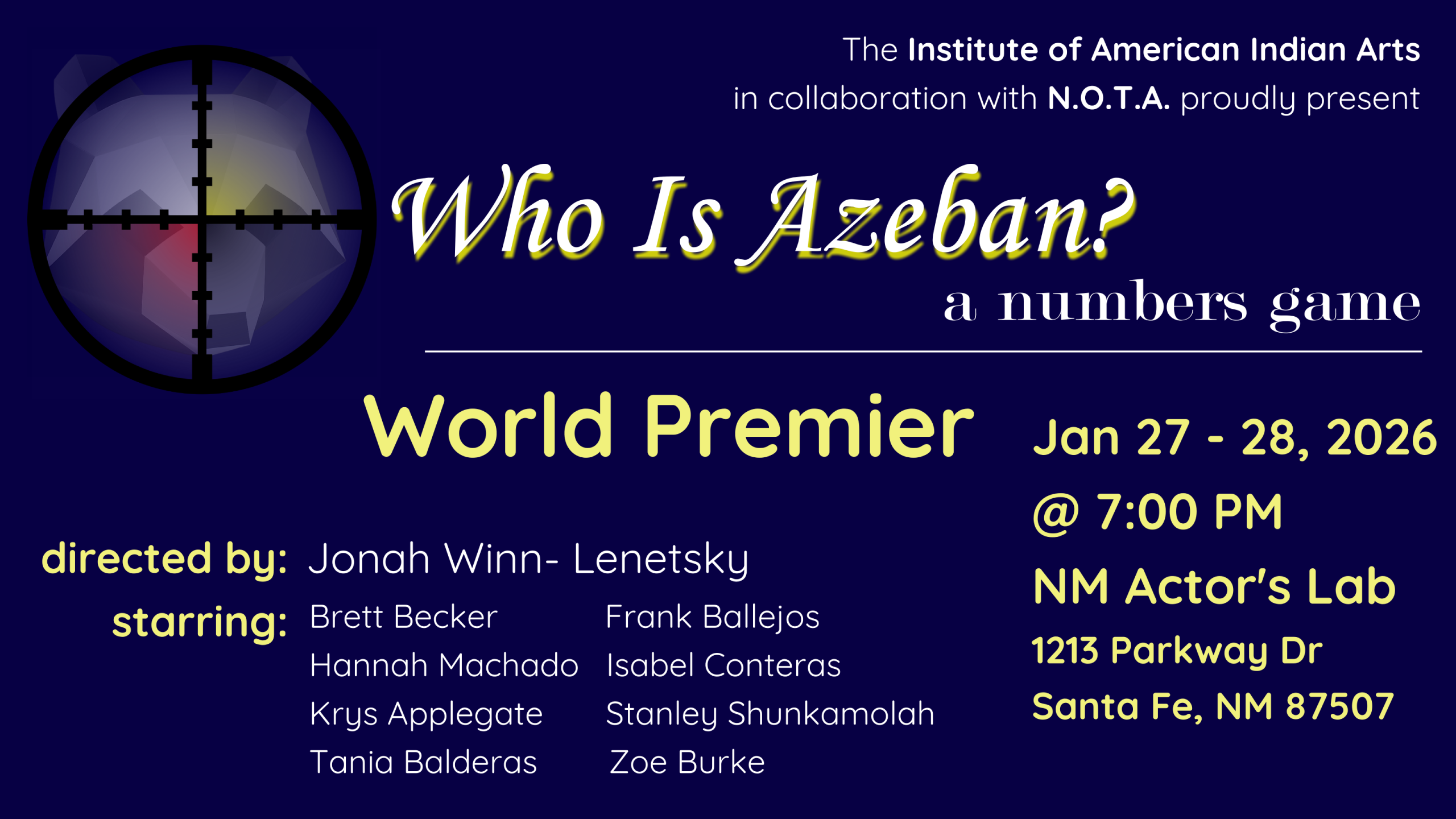 Frank is extremely excited to be performing as Colby in Who Is Azeban. This is his first production at, Institute of American Indian Arts. Frank’s acting career started way back in Highschool and has been on again, off again until 2019. Frank graduated in 2022 from the UNM Theater and Dance Department with a BA in Theater. There he played Alfonso Frankenstein (Frankenstein, RT) and Frank/Juliette (Last Dream, X), but you may remember him as Father Dupin/Gypsy (Hunchback of Notre Dame, MTS) or Pedro {Man of La Mancha, MTS). He is formerly from California, but now resides in Mountainair, NM